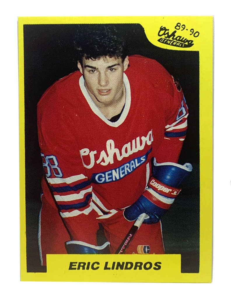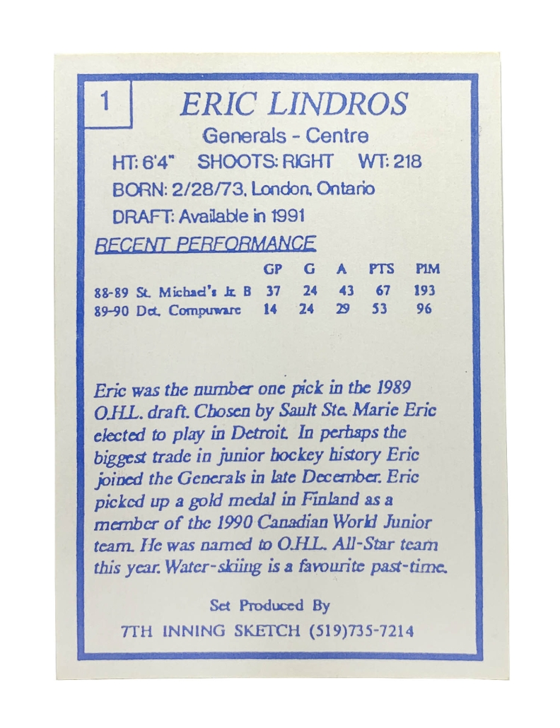 The “Eric Lindros #1 1989-1990” refers to the 1989-90 7th Inning Sketch OHL trading card, which is widely considered his true “pre-rookie” or “XRC” card from his time with the Oshawa Generals.